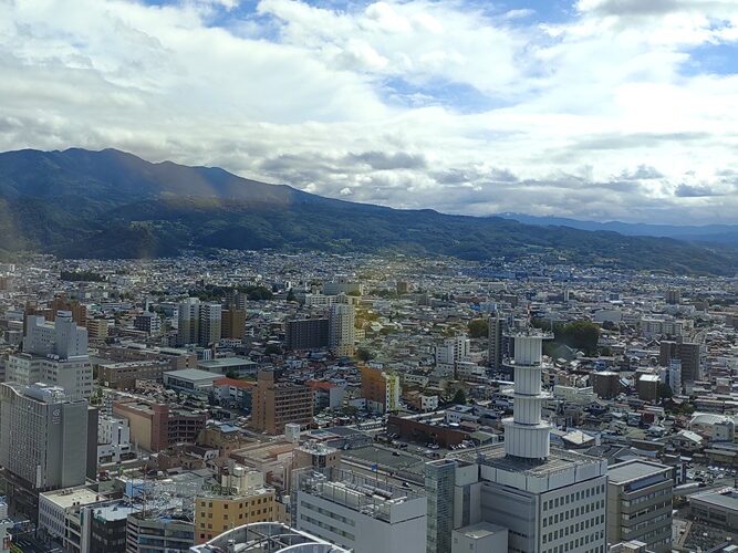 大会後に脚がヘロヘロになってしまうフルマラソンと違って、ハーフは完走後も体力に余裕をもって観光ができるという点が良い。写真は駅に近い展望台から見た蔵王方面
