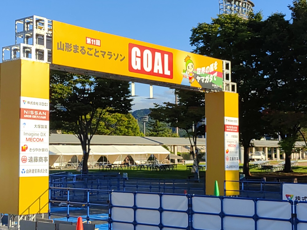 山形市の中心部で行われる「山形まるごとマラソン」。ハーフがメイン種目でほかに3㎞と5㎞の部門がある。大会名に「まるごと」が加えられているのは大会を通じて山形の自然、歴史、文化などをまるごと味わえるという思いが込められている。その名の通り、コースは市内の中心部を走る。市街地コースはほとんどアップダウンが無い。スタートは山形駅から4㎞ほど北上した山形総合スポーツセンター。ここから町の中心部に向かって南下する。中盤12㎞まではほぼ市街地。それ以降は馬見ヶ崎川沿いがコースとなっている。川沿いのコースは折り返しの14㎞あたりまでは上り、あとはフィニッシュまでほぼ下りのコース。ハーフなのである程度の練習をすれば楽なコースと言える。