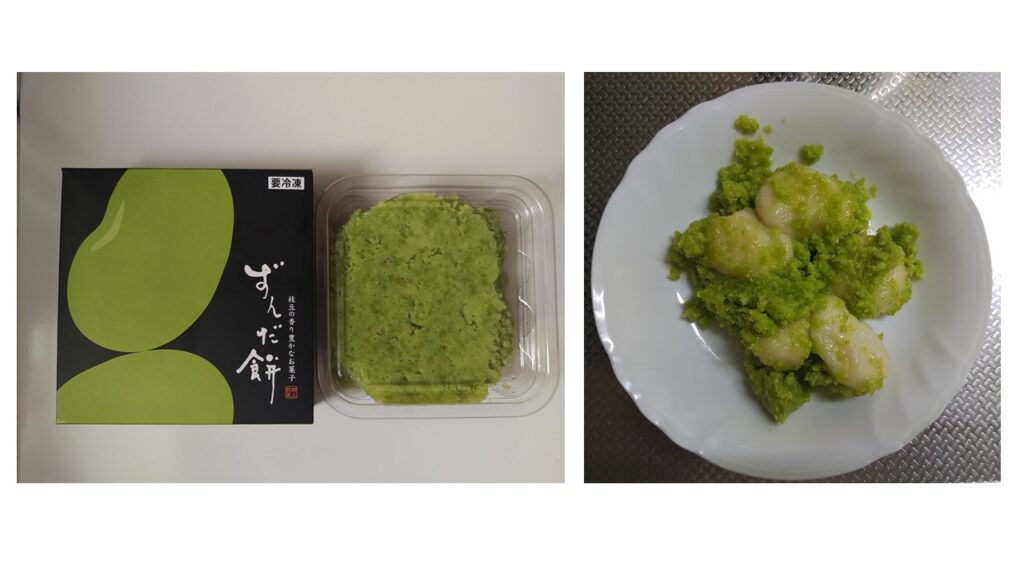 仙台と言えば「ずんだ餅」。枝豆をすりつぶした餡と餅。冷凍されているので常温3時間ほどで解凍。冷蔵庫に入れておけば3日ほど持ちます。