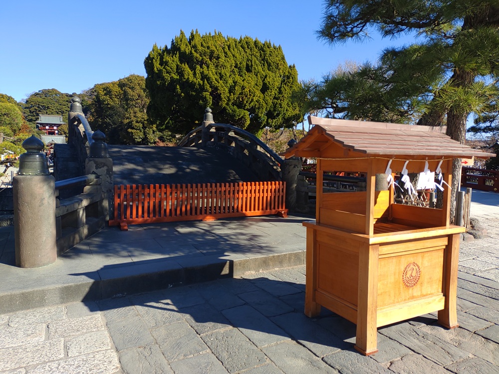 鶴岡八幡宮に到着。現在は渡れなくなった太鼓橋。昔はこの太鼓橋を一気に渡れたら願い事が叶う、と言われていた