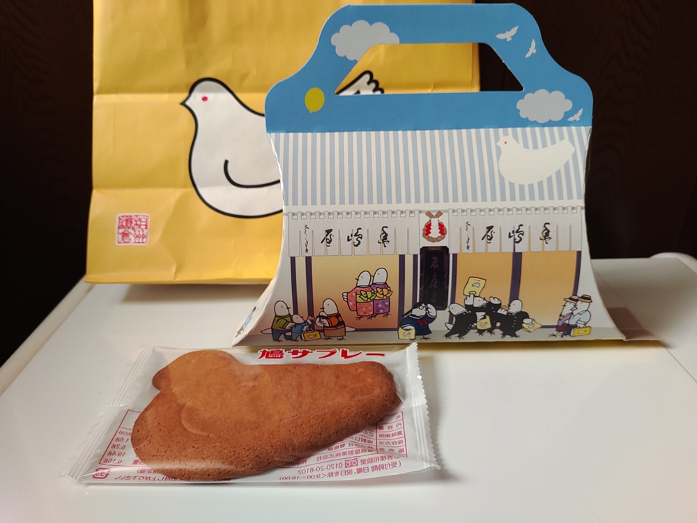 鎌倉と言えば豊島屋さんの鳩サブレ―ですね。普通は黄色い鳩の図柄の放送ですが、これは本店限定包装だそう